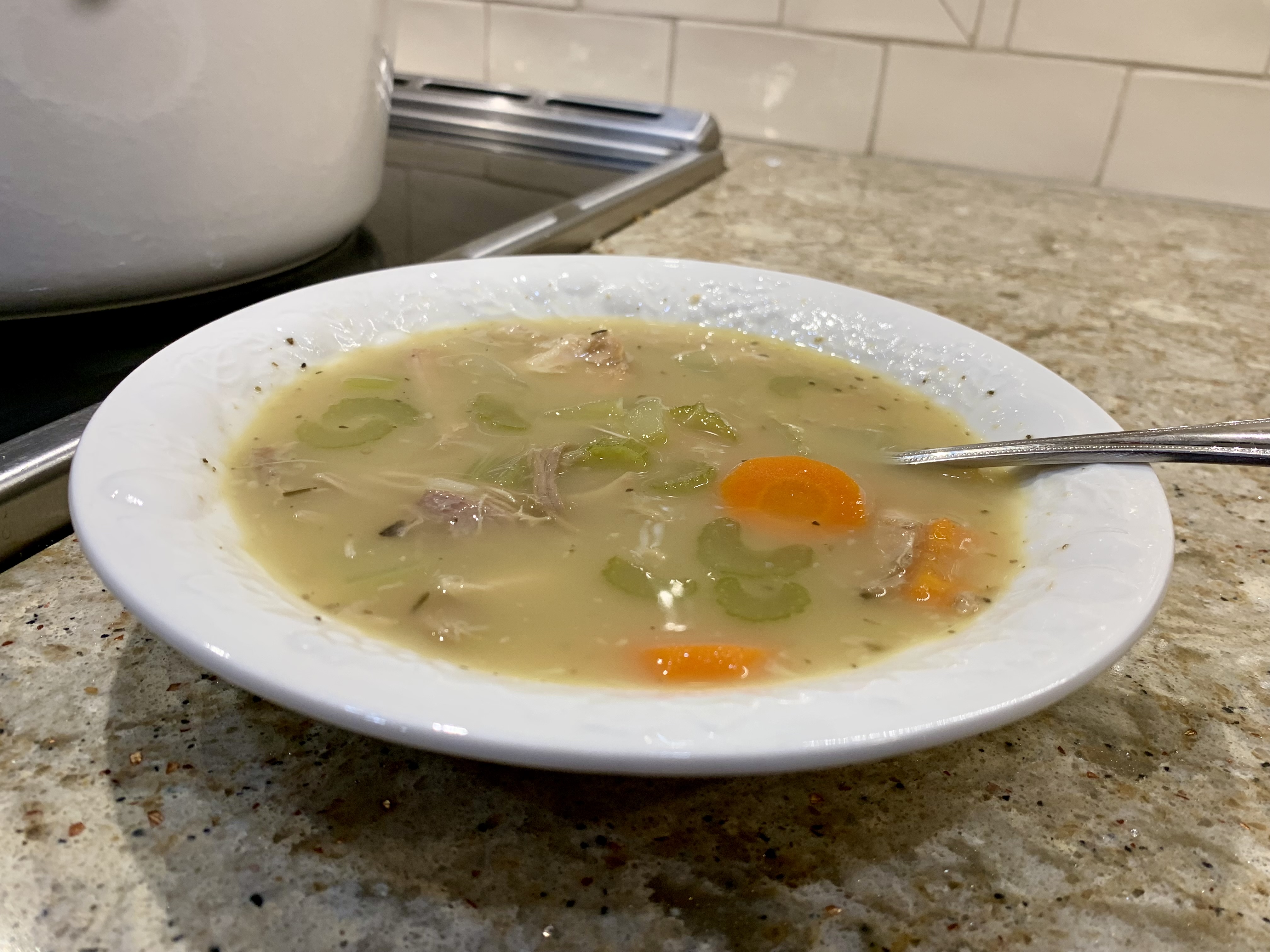 Homemade Turkey and Rice Soup made from the leftover carcass of a roasted turkey.