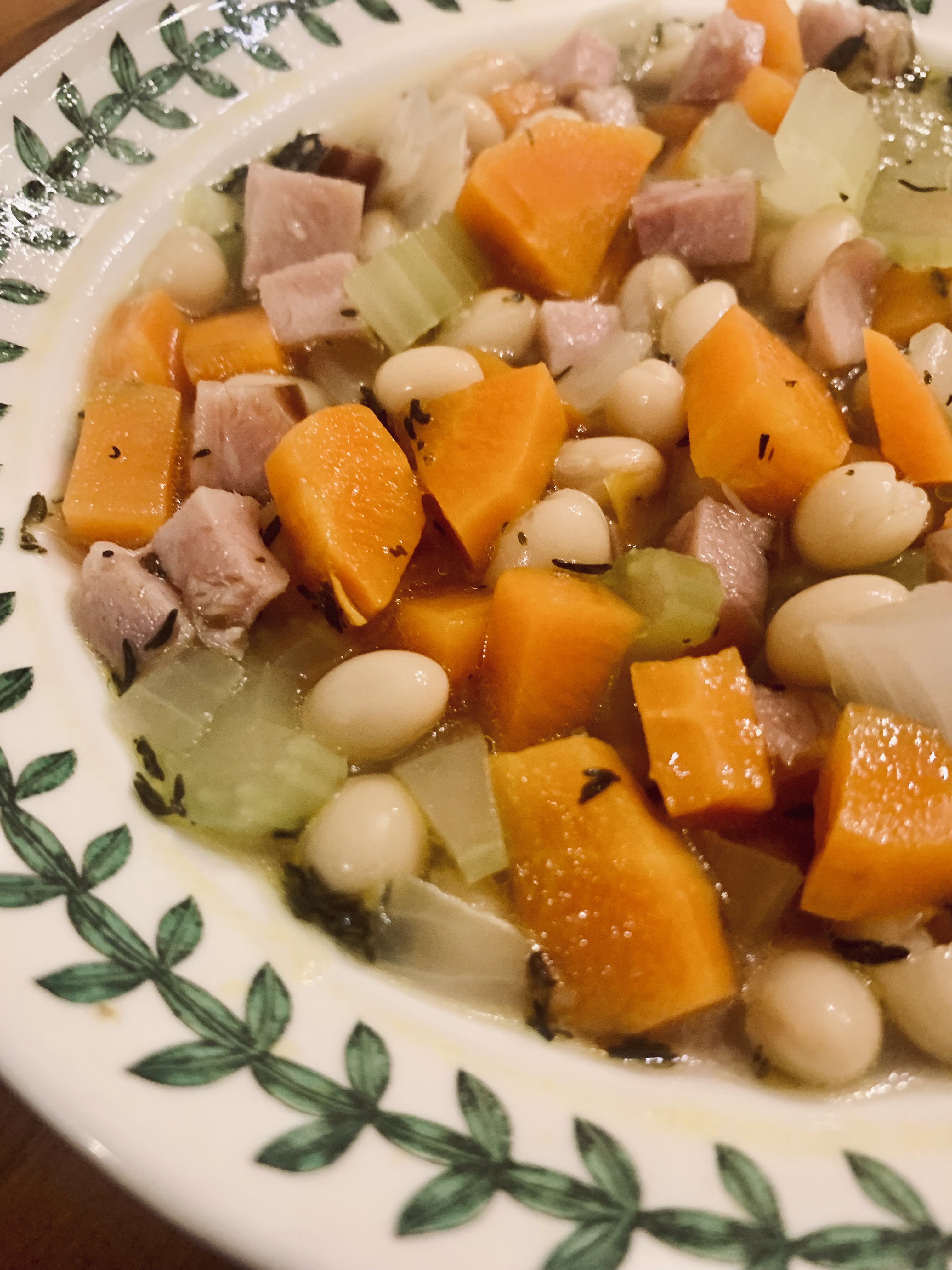 I like to make a roast dinner of featuring chicken, ham, pork or beef on Sundays. When I have leftover meat, I usually turn it into a soup. This is my go to recipe for leftover roasted ham. Served with cornbread and a green salad it makes a very quick and delicious weeknight meal.