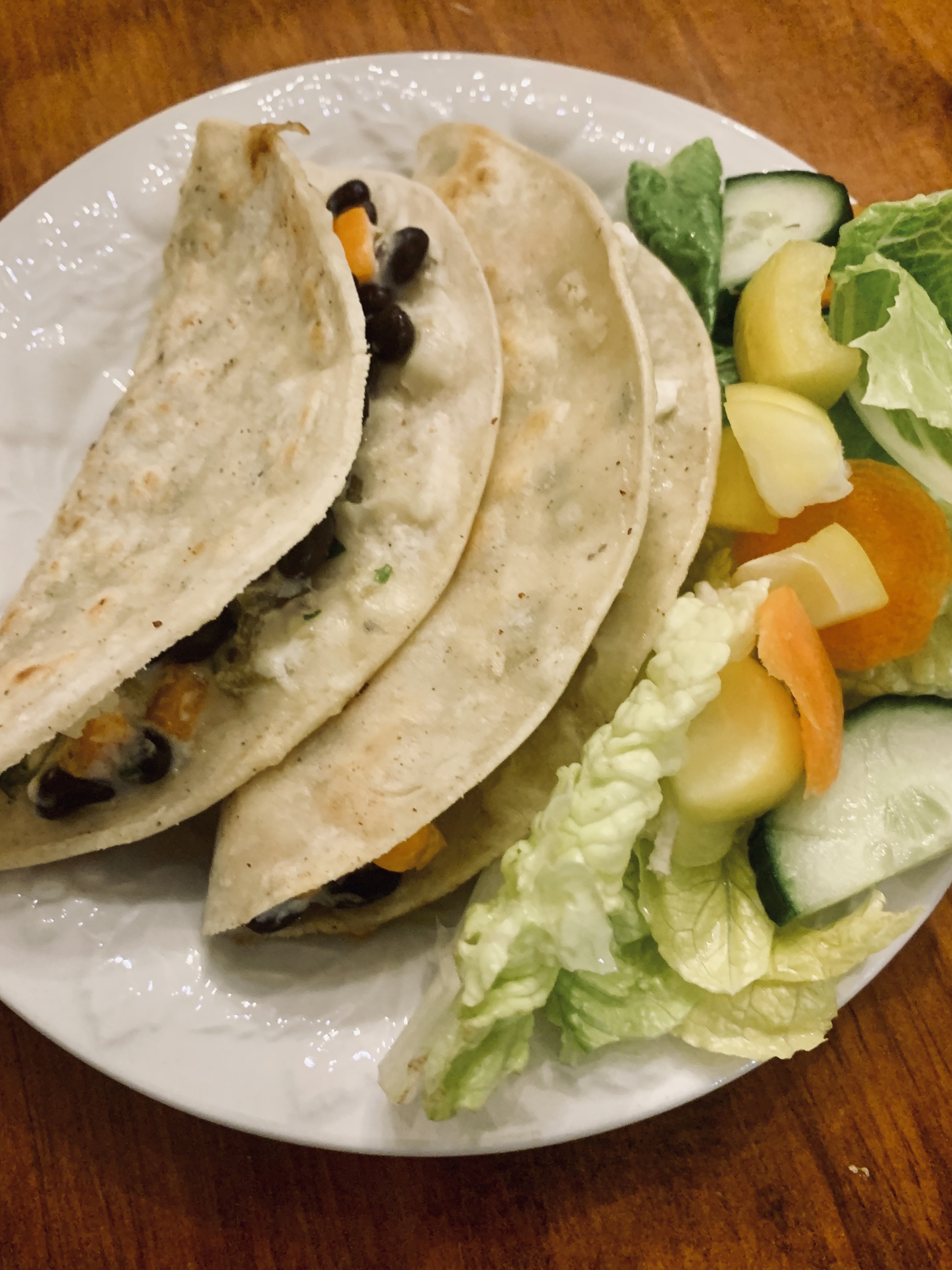 A quick and easy weeknight vegetarian supper. The combination of the black beans and the two types of goat cheese is surprisingly delicious. They also taste great cold, making any leftovers a perfect snack.