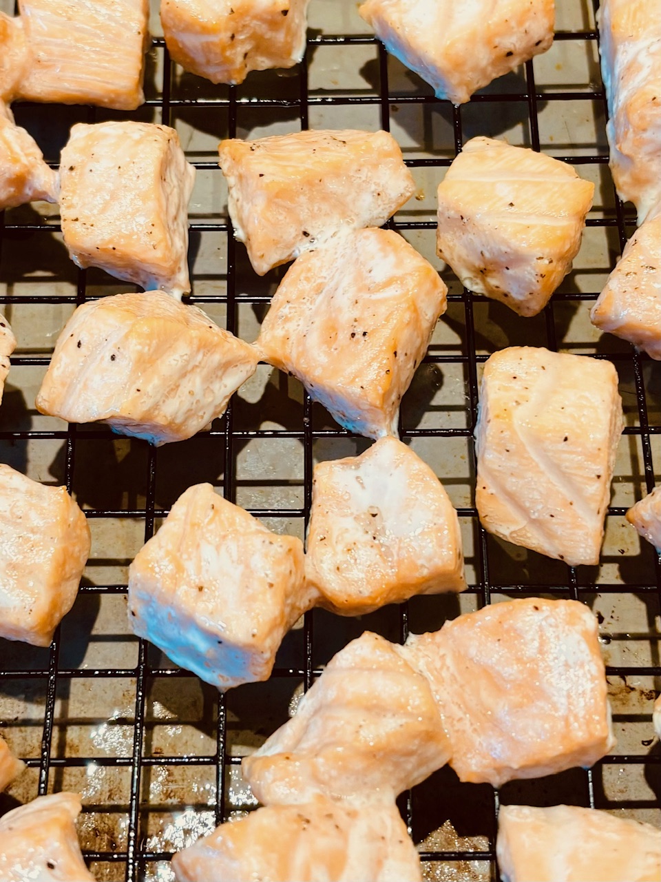 - Place the seasoned salmon cubes on the wire rack (See picture below).