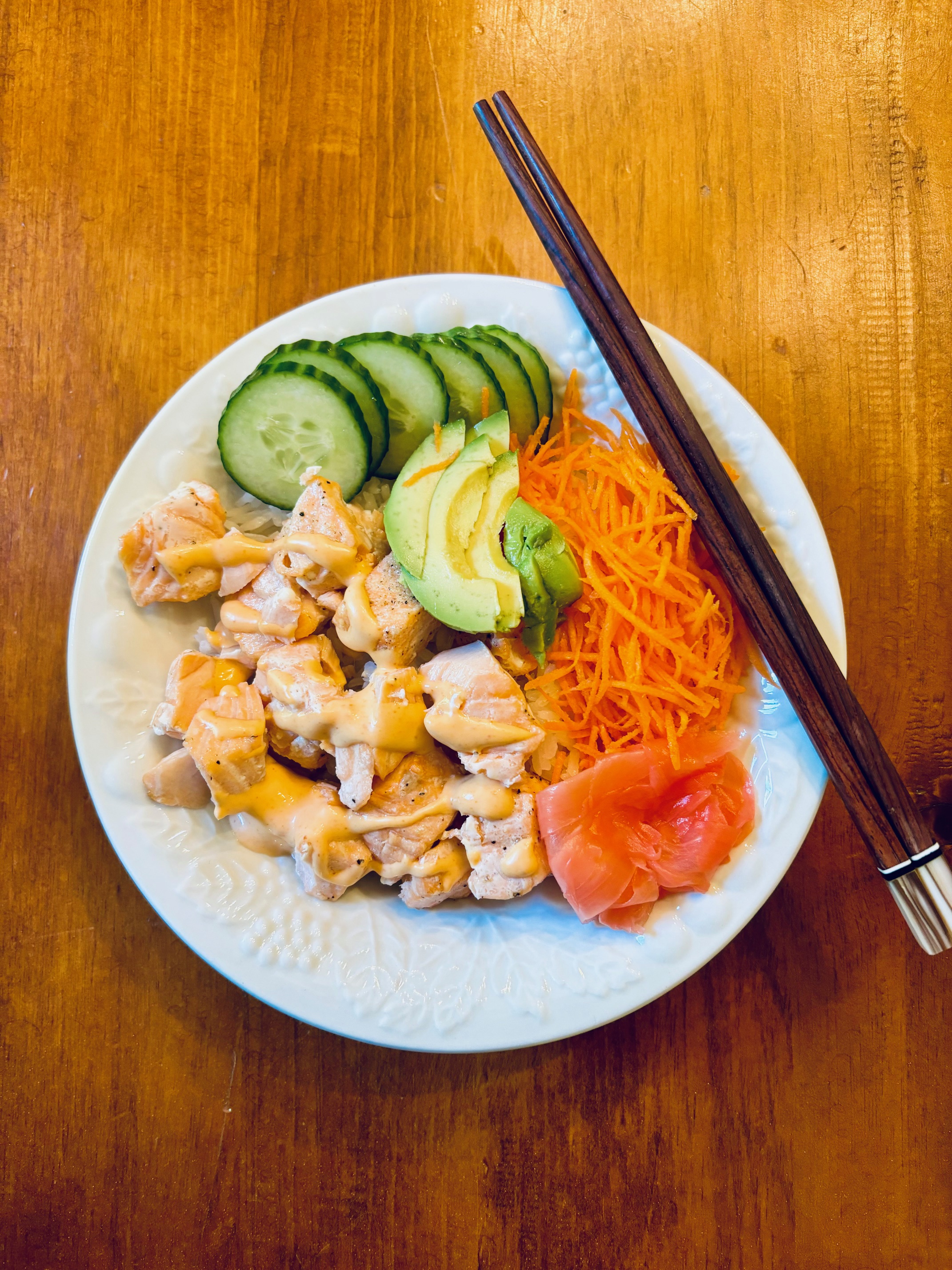- Once the rice and salmon are cooked, assemble the salmon sushi bowls.